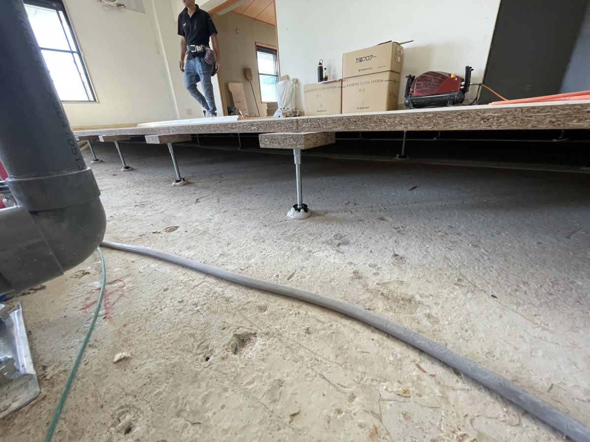 床はレベル調整が必要なため、鋼製束からやり直しを行い、安定した基礎を整えます。リビングはドーム天井になっており、そこに間接照明を取り入れ、完成後には柔らかな光に包まれる上質空間を演出予定です。