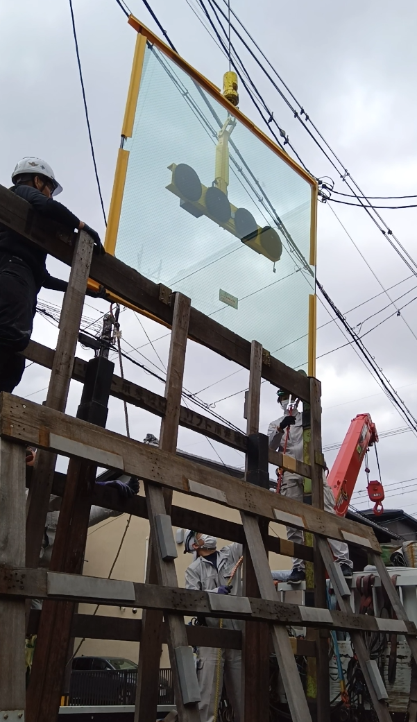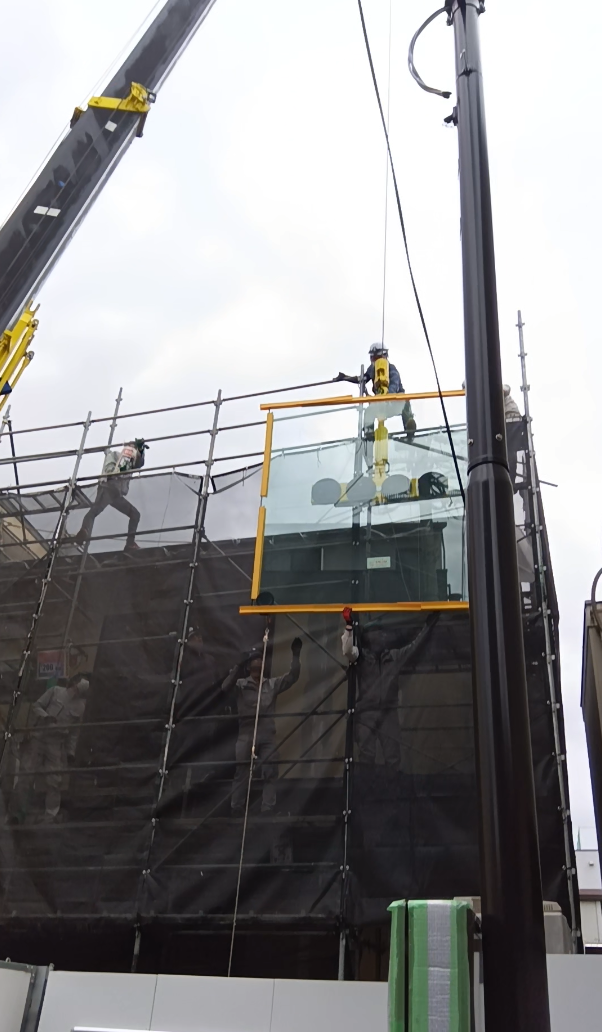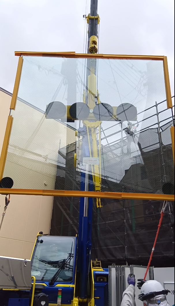 私も過去に何度か大きなガラスを荷揚げするのにクレーン等の重機を段取りしたことはありますが、ここまでの大きなものは初めてです。