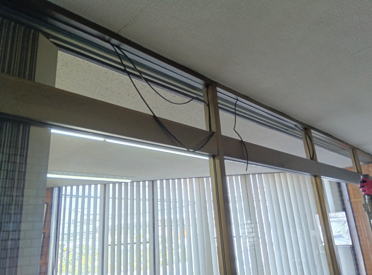 見せて頂いたところ、事務所へあがる階段室と事務所の間仕切りになっている、かなり大きなフロントサッシのFIXガラスの押さえビートが取れている状態でした。