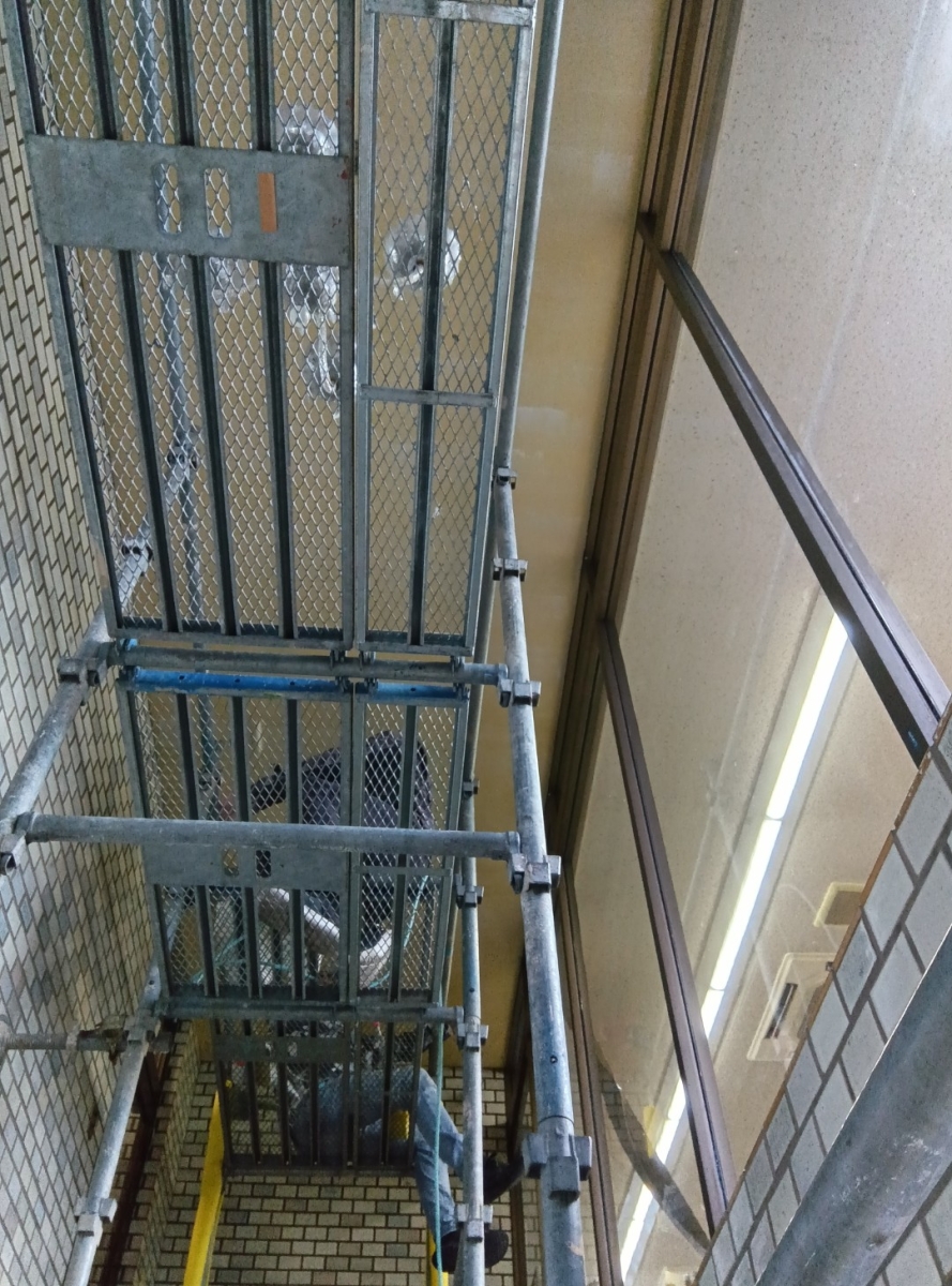 しかし、この写真のように、階段室のためさすがに脚立での作業はできません。